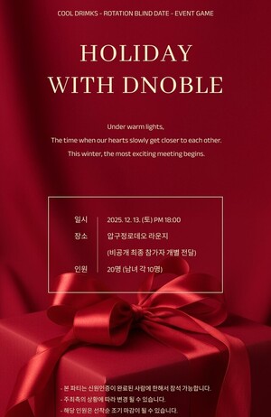 노블레스 결혼정보회사 디노블이 오는 12월 13일(토) 오후 6시, 압구정로데오 라운지에서 연말 프라이빗 미팅 파티 ‘HOLIDAY WITH DNOBLE’을 개최한다.디노블은 지난 10월, 수십 명 규모의 연말파티를 성황리에 마무리하며 참가자들로부터 높은 만족도를 이끌어냈다. 실제 커플 매칭과 지속적인 만남으로 이어진 사례가 나오면서, 행사 직후부터 “다음 파티는 언제 열리느냐”는 문의가 이어졌고, 이번 12월 행사 역시 오픈과 동시에 신청이 빠르게 몰리고 있는 상황이다.올해 12월 진행되는 ‘HOLIDAY WITH DNOBLE’은