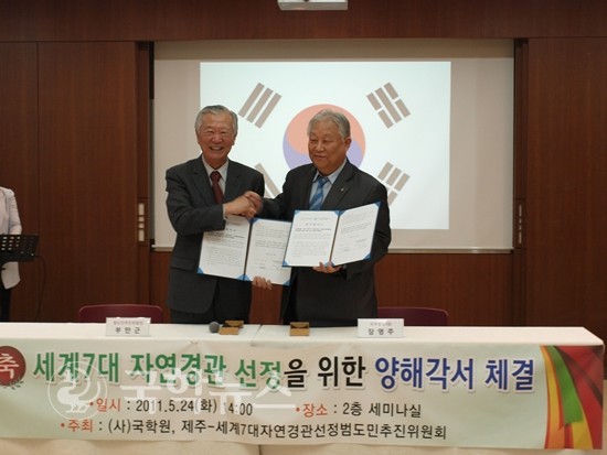 사단법인 국학원과 제주 범도민추진위원회는 지난 5월 24일 국학원(천안)에서 제주도 세계 7대 자연경관 선정을 위한 양해각서(MOU) 체결식을 했다. 제주도 측에서 부만근 범도민추진위원장과 양창헌 부위원장, 강철 팀장이 참석했으며 국학원에선 장영주 원장(대행)과 고성보 제주국학원장, 한승용 교육이사가 자리했다.