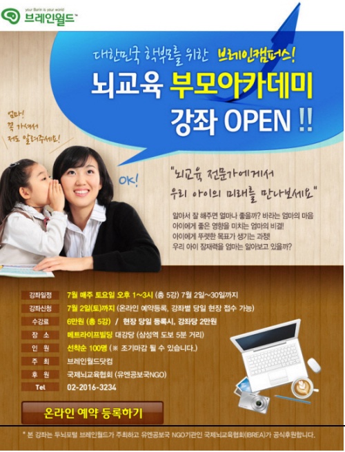 '뇌교육 부모아카데미'는 5주 5강좌로 7월 한달동안 매주 토요일 오후 1시에서 3시까지 서울 삼성역에 위치한 메트라이프빌딩 대강당에서 진행되며, 비용은 6만원. 신청은 브레인월드닷컴(www.brainworld.com)에서 하며, 전문강좌에 비해 저렴한 비용인 관계로 선착순으로 100명 인원으로 모집된다