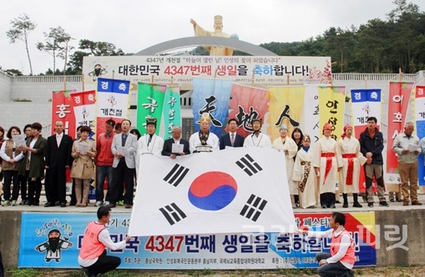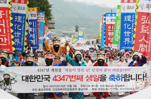 서울에서는 광화문부터 덕수궁까지 47명의 단군할아버지와 선녀, 인성의 꽃으로 꾸민 청년들과 시민 1,000여 명이 대한민국 생일축하 거리행진을 진행했다. 국학원 본원(충남 천안)은 한민족역사문화공원에서 한민족 전통의 개천 천제를 재현하며 천안시민들이 함께하는 풍물 길놀이와 어르신 효 잔치 등 문화행사를 개최했다. 이외에도 부산과 인천, 대전, 광주, 청주 등지에서도 개천절을 축하하는 행사가 열렸다.