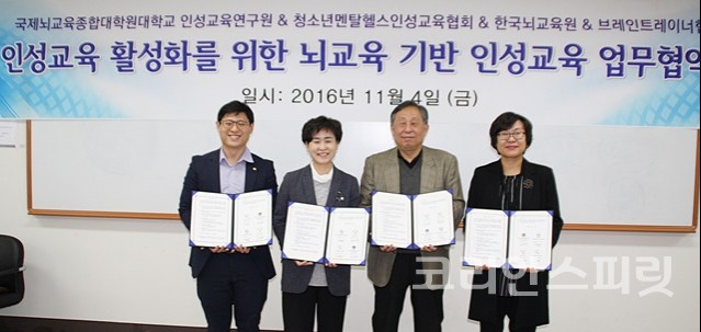 국제뇌교육종합대학원대학 인성교육연구원(원장 신혜숙), 청소년멘탈헬스인성교육협회(회장 김나옥), 한국뇌교육원(원장 권영주), 브레인트레이너협회(협회장 전세일) 등 4개 기관이 지난 4일 국제뇌교육종합대학원대학교에서 인성교육 활성화를 위한 업무협약(MOU)을 체결했다.