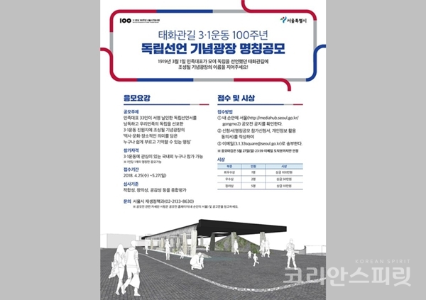 ![서울시는 지난 25일부터 5월 27일까지 태화관긴 독립선언 기념광장 명칭공모를 진행한다. [사진=서울시 제공]](https://cdn.ikoreanspirit.com/news/photo/201804/51338_60731_237.jpg)