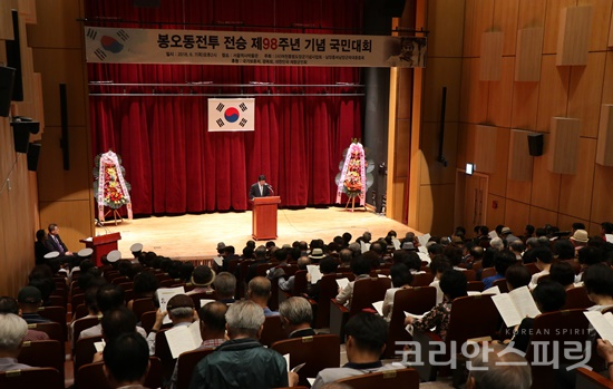 ![봉오동전투 전승 제98주년 기념 국민대회가 6월 7일 오후 서울역사박물관 강당에서 (사)여천 홍범도장군기념사업회 후원회원, 육군사관학교 군악대, 해군홍범도함 승조원 등 300여명이 참석한 가운데 개최됐다. [사진=김경아 기자]](https://cdn.ikoreanspirit.com/news/photo/201806/51629_61335_4422.jpg)