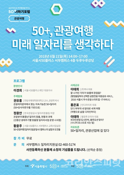 ![서울시50플러스재단은 21일(목) 오후 2시부터 서울시50플러스 서부캠퍼스에서 ‘50+, 관광여행 미래 일자리를 생각하다’ 라는 주제로 관광여행분야 중장년층 일자리 발굴 논의를 위한 포럼을 개최한다. [사진=서울시]](https://cdn.ikoreanspirit.com/news/photo/201806/51684_61448_1147.jpg)