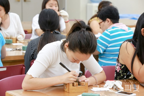 재외동포재단이 주최하고 이화여자대학교 언어교육원이 주관한 2018 CIS지역 한국어교사 초청연수에 참가한 고려인 한국어 교사들이 5일(목) 서울 용산구 국립중앙박물관에서 전통문화 체험으로 인장 만들기를 하기 전에 설명을 듣고 있다. [사진=재외동포재단]