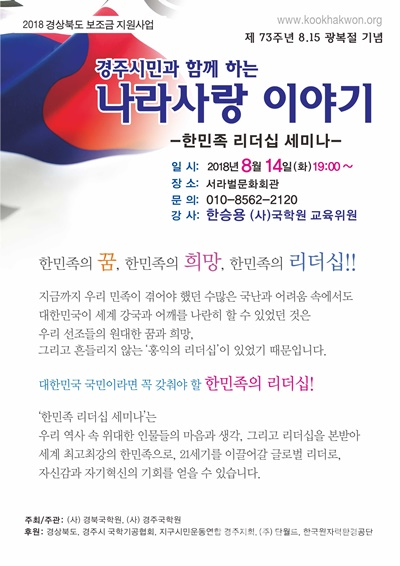 ![경북국학원과 경주국학원은 제73주년 광복절을 기념하여 경주시민과 함께하는 나라사랑 이야기 '한민족 리더십 세미나’를 오는 14일 경주 서라벌문화회관에서 개최한다. [사진=경북국학원]](https://cdn.ikoreanspirit.com/news/photo/201808/52280_62517_5051.jpg)