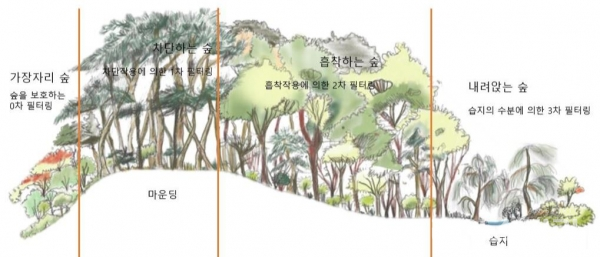 이 도시숲은 키 작은 나무, 중간나무, 키 큰 나무를 섞어 심는 다층구조 방식으로 조성된다. 이는 미세먼지 저감 효과를 극대화하는 방법이다.