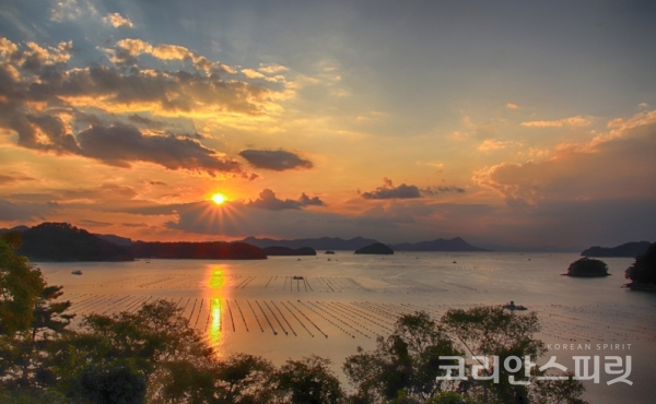 고성만은 복주머니 형태를 띠고 높은 산줄기가 바람을 막아 바다는 호수처럼 잔잔하다. 청정한 바다에 파도마저 없으니 굴 양식에 최고다. 그래서 해지개길은 바다위에 떠 있는 하얀 부표를 감상하고 알싸한 굴향기를 맡으며 달리게 된다.