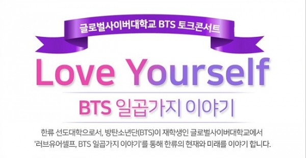 ‘러브유어셀프, BTS 일곱가지 이야기’를 주제로 펼쳐질 글로벌사이버대학교 BTS토크콘서트는 오는 1월 26일(토) 오후 2시부터 4시까지 일지아트홀(서울 청담동)에서 개최된다.