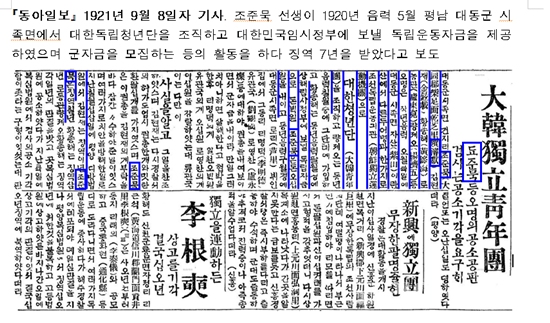![동아일보 1921년 9월 8일자 기사. 조준묵 선생이 1920년 음력 5월 평남 대동군 시족면에서 대한독립청년단을 조직하고 대한민국임시정부에 보낼 독립운동자금을 제공하였으며 군자금을 모집하는 등의 활동을 하다 징역 7년을 받았다고 보도했다. [자료=국가보훈처]](https://cdn.ikoreanspirit.com/news/photo/201902/54152_66313_5744.png)