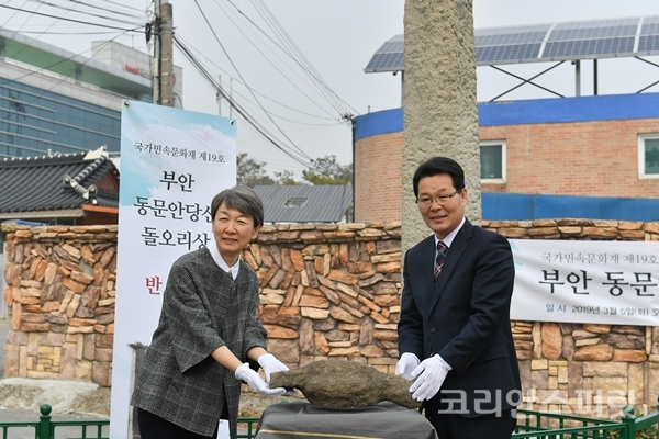 문화재청(청장 정재숙)은 오늘(5일) 오전 11시, 전북 부안군 동문안 마을에서 국가민속문화재 제19호 ‘부안 동문안 당산(扶安 東門안 堂山)’ 돌오리상 반환식을 개최했다.