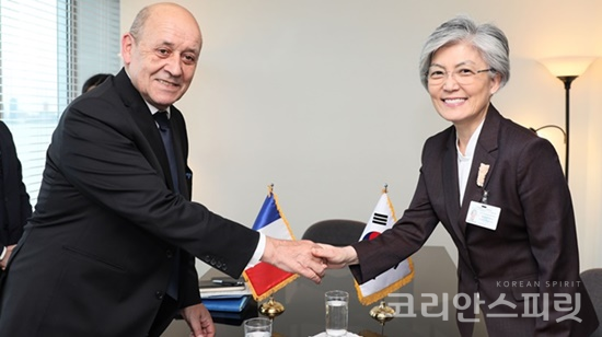![유엔 평화유지 장관회의(뉴욕)에 참석중인 강경화 외교장관은 3월 28일 (목) 르 드리앙(Le Drian) 프랑스 외교장관과 회담을 갖고, 양국 실질협력, 기후변화 등 세계적 현안, 최근 한반도 정세 등을 협의하였다. [사진=외교부]](https://cdn.ikoreanspirit.com/news/photo/201903/54541_67109_5558.jpg)