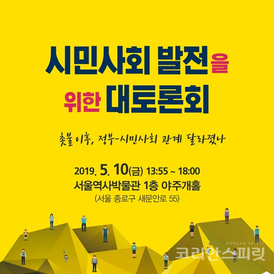 ![국무총리소속 시민사회발전위원회는 5월10일(금) 오후 서울 종로구 새문안로 서울역사박물관에서 ‘시민사회 발전을 위한 대토론회’를 개최하고, 촛불 이후 제도혁신과 민관협치, 시민참여 측면에서 정부-시민사회 관계를 어떻게 발전시킬 것인지를 논의했다. [포스터=시민사회단체연대회의]](https://cdn.ikoreanspirit.com/news/photo/201905/54965_67886_553.jpg)