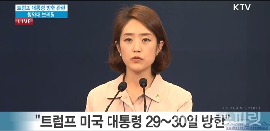 ![트럼프 미국 대통령 29~30일 방한. 도널드 트럼프 미국 대통령이 도널드 트럼프 미국 대통령은 6월29일(토)부터 30일(일)까지 1박2일간 한국을 공식 방문해 문재인 대통령과 정상회담을 할 예정이라고 고민정 청와대 대변인이 발표하고 있다. [사진=KTV 화면 갈무리]](https://cdn.ikoreanspirit.com/news/photo/201906/55458_68764_5739.png)