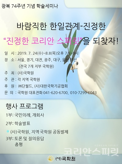 ![사단법인 국학원은 7월 24일부터 8월 8일까지 전국 지역 국학원에서 “바람직한 한일관계-진정한 코리안스 피릿을 되찾자”라는 주제로 전국 릴레이 학술세미나를 개최한다. [포스터=국학원]](https://cdn.ikoreanspirit.com/news/photo/201907/55767_69375_3525.jpg)