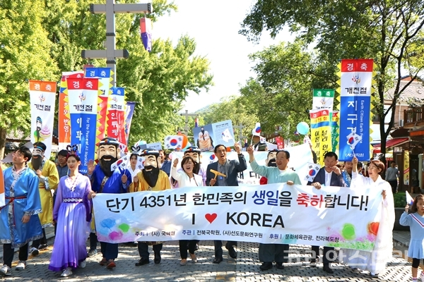 ![개천문화대축제에 참가한 시민들이 거리퍼레이드 행렬해 합류해 한민족의 생일을 축하하고 있다. [사진=선도문화연구원]](https://cdn.ikoreanspirit.com/news/photo/201909/56470_70569_5445.jpg)