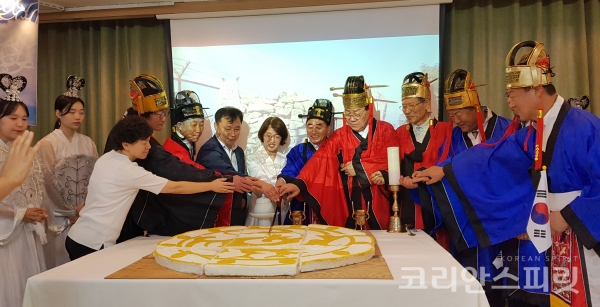 ![4352년 개천절을 기념하고 축하하기 위해 내외빈들이 모여 삼족오 떡 컷팅식을 하고 있다. [사진=대구국학원]](https://cdn.ikoreanspirit.com/news/photo/201910/56589_70844_5123.jpg)