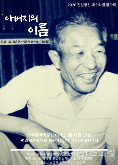 ![연극 '아버지의 이름' 포스터. 연극 '아버지의 이름'은 역사학자 임종국을 소재로 한 가상의 연극-‘아버지의 이름’-을 만드는 연극인들의 이야기이다. [포스터=문화나눔 공존]](https://cdn.ikoreanspirit.com/news/photo/202003/57890_73192_4054.jpg)