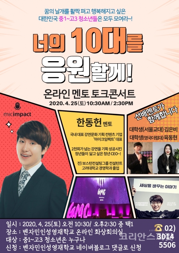![벤자민인성영재학교는 오는 25일 오전 10시 30분과 오후 2시 30분 '너의 10대를 응원할게!' 두번째 온라인 멘토 토크콘서트를 개최한다. [사진=벤자민인성영재학교]](https://cdn.ikoreanspirit.com/news/photo/202004/58318_73921_2655.png)