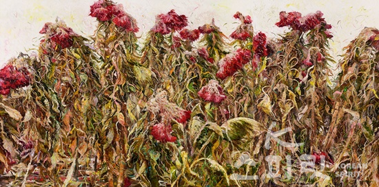 “복잡한 도심 한가운데 누군가에 의해 심어졌을 맨드라미는 절정의 시기를 거치고 12월 추운 바람을 버티며 서로에게 어깨를 기대고 서 있는 모습은 코로나 바이러스로 충격과 절망의 시간을 버티고 있는 우리들의 모습이다. 처절하고 아프나 굳은 의지로 서로에게 어깨를 내주는 맨드라미의 모습에서 나는 다시금 희망을 가진다. 우리는 다시 이겨 낼 것이고 자연에 의지하며 교감하는 우리로 다시 태어나길 바라는 마음으로 이번 전시에 임한다.”(작가노트)
