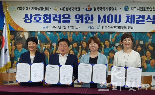 ![경북국학원, 경상북도국학기공협회, 지구시민운동연합경북지부는 경북장애인자립생활센터와 홍익정신을 토대로 장애인들의 행복 증진과 사회적 통합을 위해 상호 협력하기로 하고 7월 17일 업무협약을 맺었다. [사진=경북국학원]](https://cdn.ikoreanspirit.com/news/photo/202007/59156_75662_25.jpg)