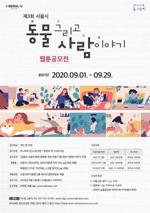 ![서울시는 네이버 ‘동물공감’판 운영자 ㈜동그람이와 함께 제3회 서울시 ‘동물 그리고, 사람이야기’ 웹툰 공모전을 9월 1일부터 29일까지 개최한다. [포스터=서울시]](https://cdn.ikoreanspirit.com/news/photo/202009/59789_76908_4259.jpg)