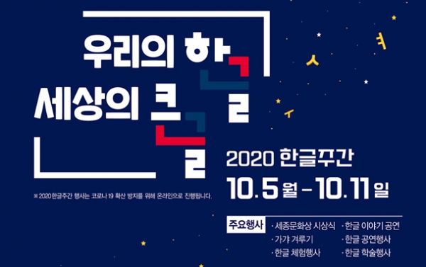![문화체육관광부는 국립한글박물관과 함께 제574돌 한글날을 기념해 10월 5일(월)부터 11일(일)까지, ‘2020 한글주간’ 행사를 개최한다. ‘2020 한글주간’의 주제는 ‘우리의 한글, 세상의 큰 글’이다. [포스터=문화체육관광부]](https://cdn.ikoreanspirit.com/news/photo/202010/60231_77716_1611.png)