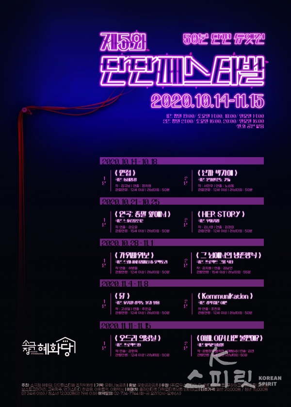 ![‘2020 제5회 단단 페스티벌’ 50분 단편 듀엣전이 2020년 10월 14일에서 11월 15일까지 서울 대학로 소극장 혜화당에서 열린다. [포스터=(주)문화공감공존]](https://cdn.ikoreanspirit.com/news/photo/202010/60395_78041_1439.jpg)