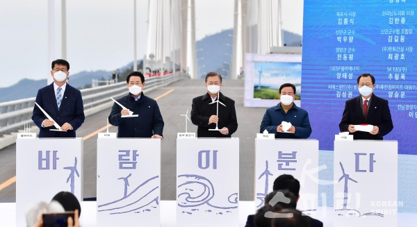 ![문재인 대통령이 5일 오후 전남 신안군 임자2대교에서 김영록 전라남도지사 등 참석자들과 '세계 최대 해상풍력단지 48조 투자협약식'을 마치고 박수치고 있다. [사진제공=전남도]](https://cdn.ikoreanspirit.com/news/photo/202102/62007_81088_1121.jpg)
