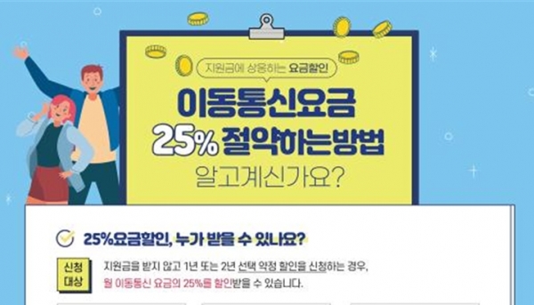 과기정통부는 통신사와 협력해 작년말 25% 요금할인 미가입자 전체에 일괄 문자메시지를 발송해 가입방법 등을 안내한데 이어, 통신3사의 약관을 개정해 약정만료자에게 발송하는 25% 요금할인 가입안내 문자메시지(SMS)를 약정만료 전·후 총 2회에서 총 4회로 확대하여 안내를 강화했다.