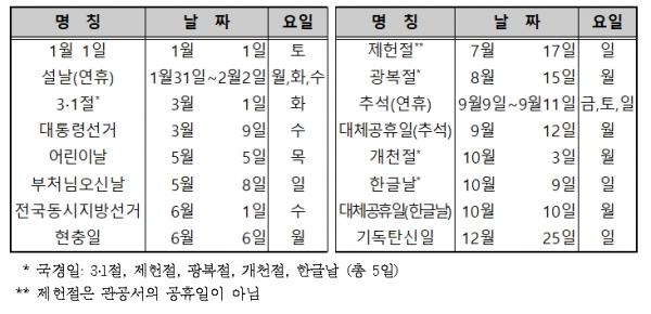 주5일제 기관을 기준으로 3일 이상 연휴는 총 6번으로, 1월 29일~2월 2일(설날 연휴 및 토·일요일, 5일), 6월 4~6일(현충일 및 토·일요일, 3일), 8월 13~15일(광복절 및 토·일요일, 3일), 9월 9~12일(추석 연휴 및 대체공휴일, 4일), 10월 1~3일(개천절 및 토·일요일, 3일), 10월 8~10일(한글날 및 토요일, 대체공휴일, 3일)이다.
