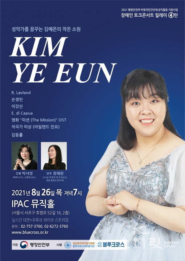 ![2021 장애인 토크콘서트 릴레이를 진행하는 성산장기려기념사업회 블루크로스의료봉사단은 8월 26일(목) 저녁 7시 ‘4차 소프라노 김예은 편’을 개최한다. [포스터제공=블루크로스의료봉사단]](https://cdn.ikoreanspirit.com/news/photo/202108/64724_86286_4039.jpg)