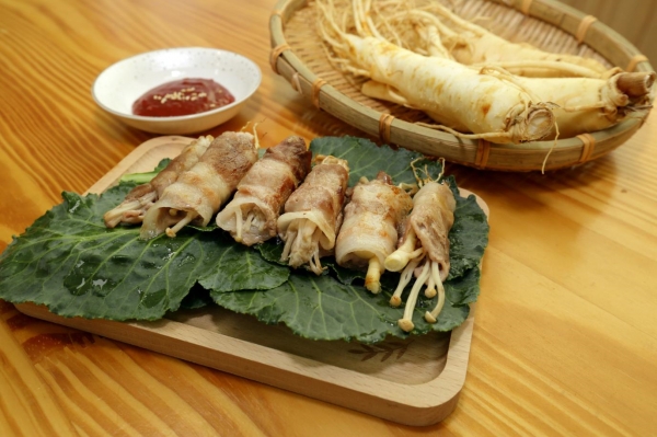 대패 겹살을 이용한 말이도 좋다. 고기 위에 감자 칼(필러)로 얇게 썬 인삼과 팽이버섯을 올린 뒤 돌돌 말아 프라이팬에 굽는다. 이때 삼겹살이 풀리지 않게 고기 이음새 부분을 먼저 익혀준다.