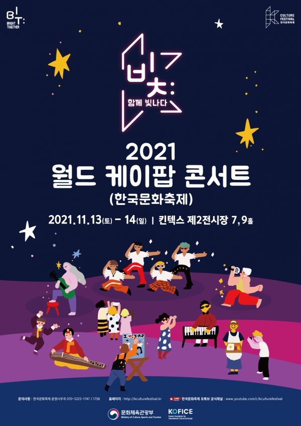 문화체육관광부(장관 황희, 이하 문체부)는 코로나 장기화로 지친 전 세계 한류 팬을 위로하고 새로운 희망의 메시지를 전달하기 위해 11월 13일(토)과 14일(일), 킨텍스(경기도 고양시)에서 ‘한국문화축제-2021 월드 케이팝 콘서트’를 개최한다. 이 콘서트는 ‘한국문화축제’ 유튜브 채널을 통해 온라인으로 생중계한다.