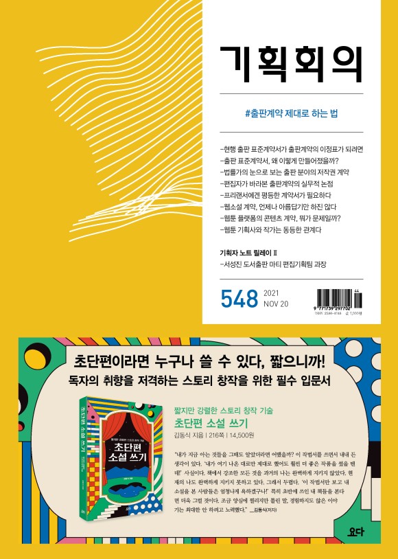 출판을 하려고 할 때 출판계약을 어떻게 해야 제대로 하는 것일까? 격주간 <기획회의> 548호(한국출판마케팅연구소, 11월 20일 발간)에서는 “#출판계획 제대로 하는 법”을 특집으로 다뤘다. 출판계약에 따른 작가와 출판사의 입장, 법률가의 시선으로 바라본 출판 분야의 저작권 계약 문제, 출판업에 종사하는 편집자와 프리랜서의 고충, 웹툰/웹소설 플랫폼의 콘텐츠 계약 기준들을 함께 점검해보며 출판계약에 관한 다양한 의문점과 대안을 정리했다.
