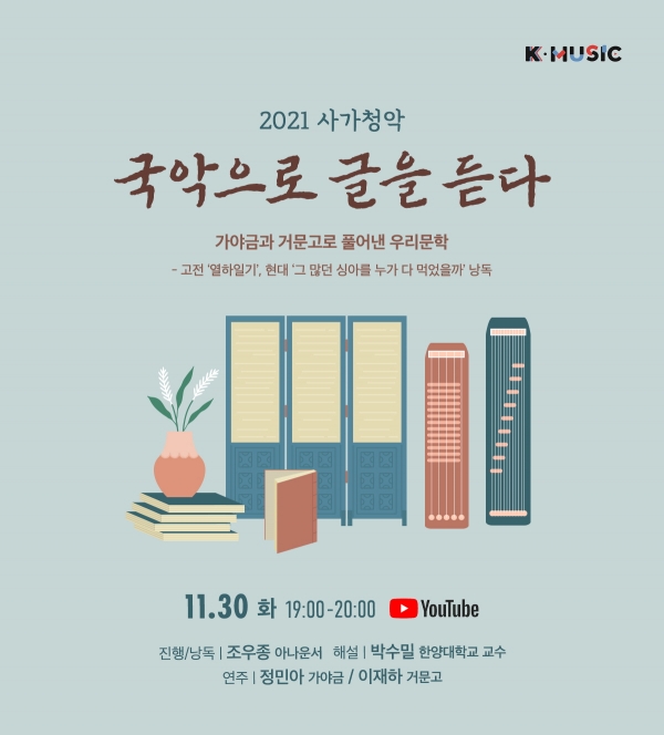 이렇게 마련한 특집방송 “2021 사가청악(賜暇聽樂) ‘국악으로 글을 듣다’_ 가야금과 거문고로 풀어낸 우리 문학”은 11월 30일 저녁 7시에 방송한다. 연말을 맞이해 우리 음악과 문학을 한 자리에서 감상할 수 있는 특집이다.