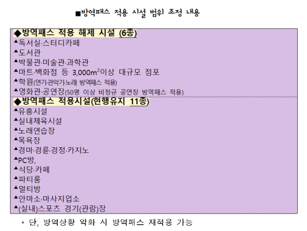 이번 조정은 마스크 상시 착용 가능성 및 침방울 생성 활동 여부 등 시설별 위험도를 고려하여 ▲독서실·스터디카페, ▲도서관, ▲박물관·미술관·과학관, ▲마트·백화점 등 3,000m2이상 대규모 점포, ▲학원(연기·관악기·노래 방역패스 적용)▲영화관·공연장(50명 이상 비정규 공연장 방역패스 적용) 6종 시설에 대한 방역패스 적용을 해제한다.