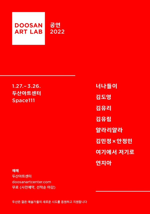 ‘두산아트랩 공연 2022’에서는 총 8팀의 예술가를 소개한다. ▲너나들이(칭작집단), ▲김도영(극작가), ▲김유리(작/연출가), ▲김유림(연출가), ▲얄라리얄라(창작집단), ▲김민정(국악창작자) x 안정민(작/연출가), ▲여기에서 저기로(창작집단), ▲연지아(극작가)가 차례로 관객들과 만난다. 총 310여팀의 정기 공모 지원자 중에서 서류심사와 인터뷰를 거쳐 선정되었다.