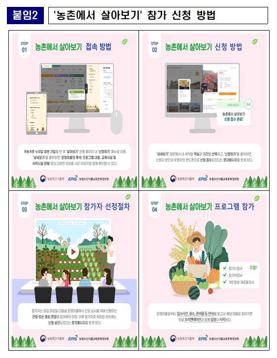 농림축산식품부(장관 김현수, 이하 농식품부)는 2022년 ‘농촌에서 살아보기’(이하 ‘살아보기’) 참가자를 23일부터 모집한다고 22일 밝혔다.