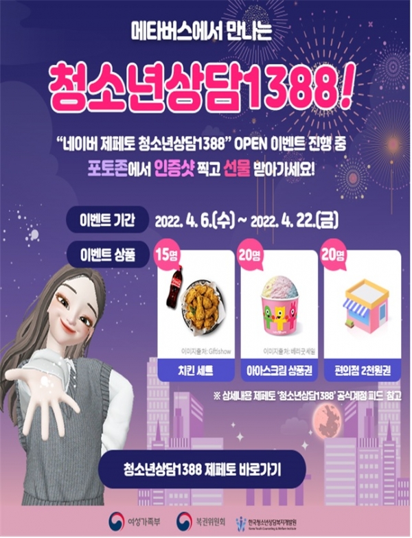 청소년이 많이 이용하는 메타버스 플랫폼인 네이버제트(Z)의 제페토(ZEPETO) 서비스에 ‘청소년상담1388 홍보관’을 열어 청소년과 비대면 소통을 진행하고, 사이버 상담으로 연계되도록 운영할 계획이다.