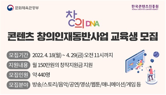 문화체육관광부(장관 황희)와 한국콘텐츠진흥원(원장 조현래, 이하 콘진원)은 ‘2022 콘텐츠 창의인재동반사업(이하 창의인재동반사업)’에 참여할 440명의 창의 교육생을 오는 4월 29일까지 모집한다고 21일 밝혔다.