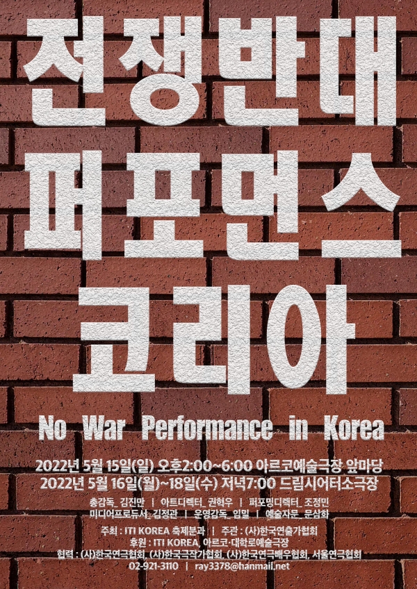 (사)한국연출가협회는 5월 15일부터 18일까지 4일간 서울 대학로 아르코예술극장 앞마당과 드림시어터소극장에서 “전쟁반대 퍼포먼스 코리아”를 개최한다.