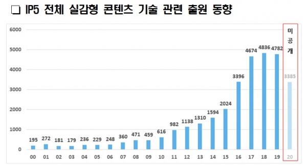실감형 콘텐츠 기술 관련 특허출원은 지식재산 세계 5대 특허청(IP5)을 중심으로 전체 출원 건수가 총 3만1천567건에 달했고, 특히, 지난 2010년 이후 연평균 19% 증가로 가파르게 성장하고 있다. 우리나라 전체(2000-2020년) 출원 건수는 총 4천524건에 달했고, 지난 2010년 이후 연평균 5%의 성장세를 나타냈다.