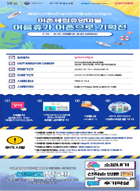해양수산부는 최근 증가하는 관광수요를 한적한 어촌마을로 유도하고, 어민소득도 증대하기 위해 관광·여가 플랫폼 야놀자(www.yanolja.com)와 함께 오는 8월 15일까지 ‘여름휴가 어촌으로’라는 기획전을 개최한다.