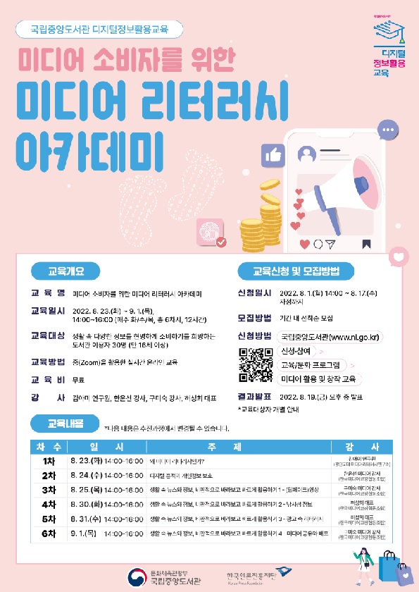 국립중앙도서관과 한국언론진흥재단은 생활 속 다양한 정보를 현명하게 소비하기 위한 미디어 정보 이해 능력 증진을 위해 미디어 소비자를 위한 미디어 리터러시 아카데미를 공동 개최한다.