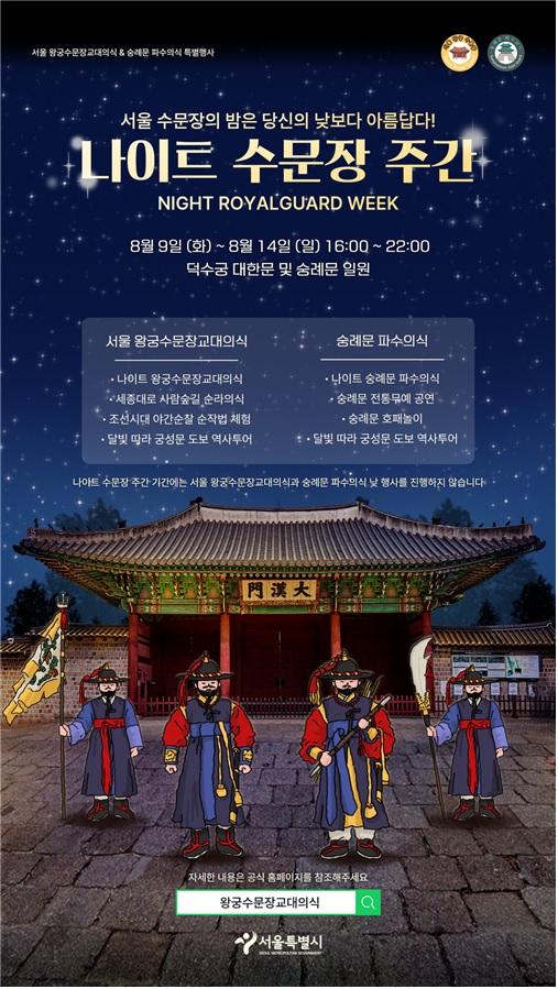 서울시는 왕궁수문장과 함께 2천년 역사도시 서울의 색다른 모습을 경험하고 여름밤의 특별한 추억을 선사하는 ‘밤의 수문장’ 행사를 9일부터 14일까지 덕수궁과 숭례문 일대에서 진행한다.