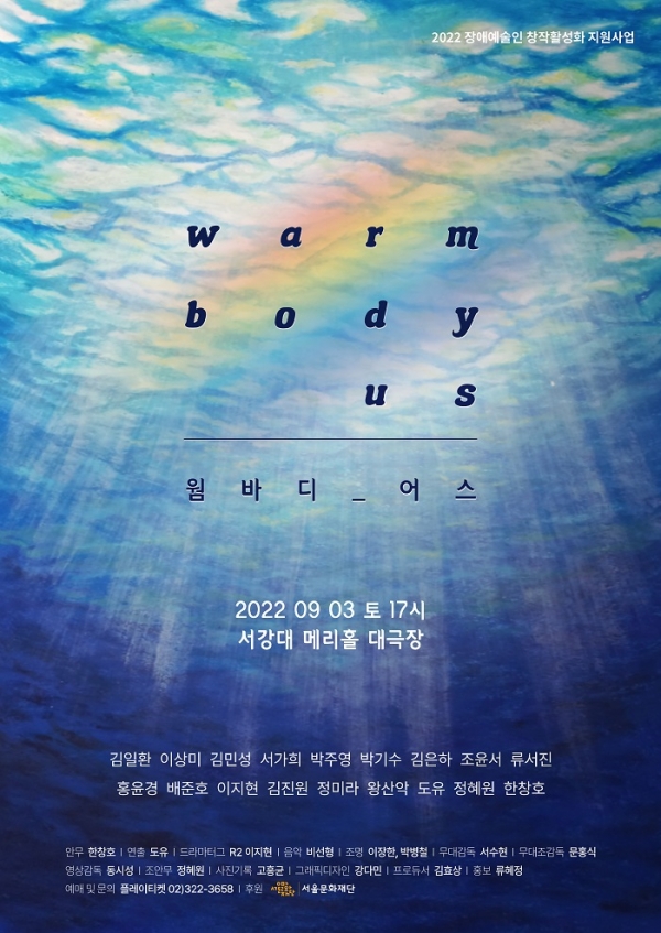 이번 공연은 2022년 장애예술인 창작활성화 지원사업으로 제작된다. ‘웜바디(warm body)_우리(us)’ 공연은 플레이티켓을 통해 예매 가능하다.