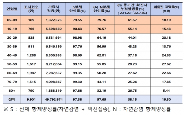 자연감염에 의한 항체양성률은 57.65%로 동기간 누적 발생률 38.15%(2022.7.30 기준)보다 19.5%P 높게 나타나 지역사회 미확진 감염자도 상당수 존재하는 것으로 확인되었다.