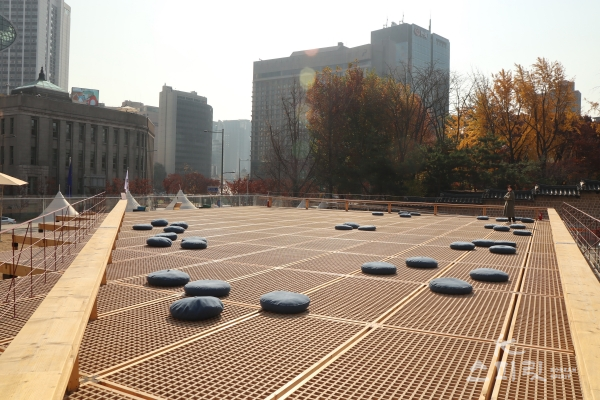 그곳에는 격자무늬 구멍이 뚫린 다공(多孔) 형태의 자작나무 평상 126개가 하나로 이어져 널찍한 대청마루가 되었다. 따뜻한 느낌을 주는 목재 평상 위에 둥근 쿠션들이 곳곳에 깔려있어 누구나 평상에 올라와 서로 담소를 나누기도 하고 필요하면 누워서 하늘을 보며 쉴 수도 있다.