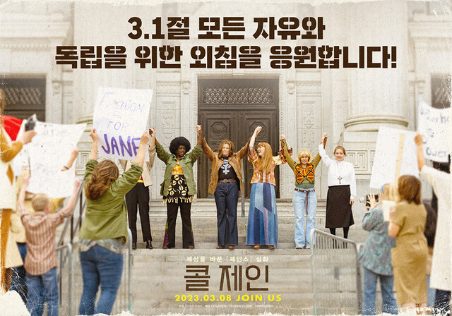 공개한 포스터는 시고니 위버를 중심으로 여섯 명의 여성들이 서로의 손을 맞잡고 만세를 하는 영화 <콜 제인> 속 한 장면을 담고 있다. 불법 임신 중절 혐의로 체포되었던 ‘제인스’ 멤버들이 법원 앞에서 그들의 석방을 촉구해온 인파를 마주하는 뜻 깊은 순간을 포착했다. 여기에 삼일절 기념 포스터답게 “모든 자유와 독립을 위한 외침을 응원합니다!”라는 카피로 영화가 추구하는 핵심 가치를 선언하고 있다.